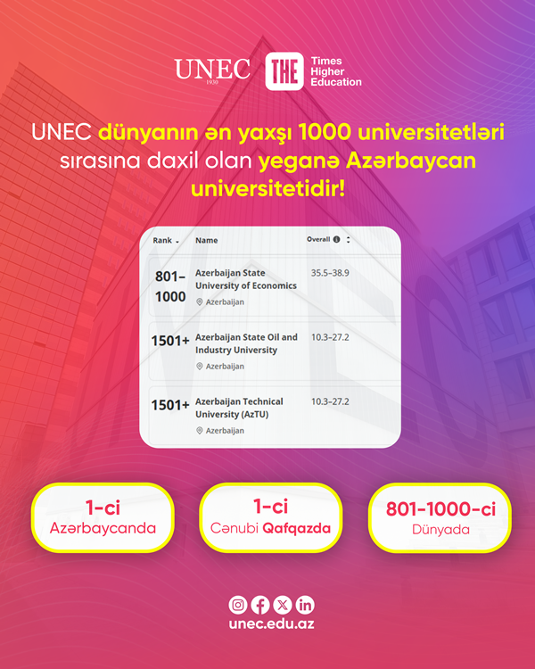 THE dünya universitetlər reytinqinə bu il ilk dəfə daxil olan UNEC Azərbaycanda birinci, Cənubi Qafqazda birinci, dünyada isə 801-1000-ci yerə yüksəldi.