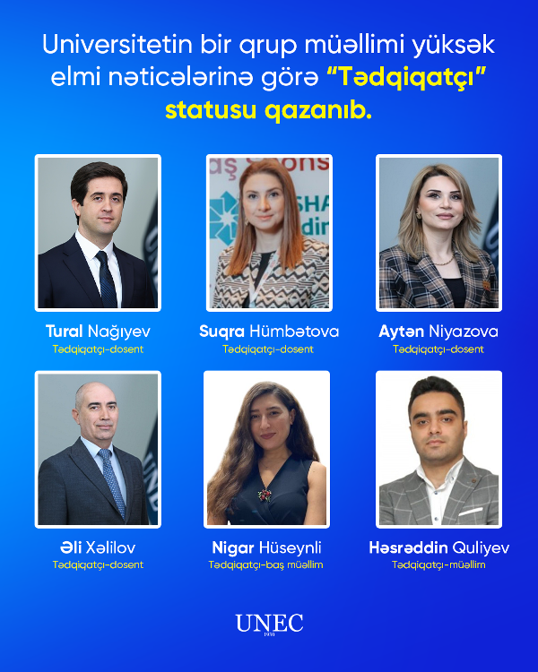 Universitetin bir qrup müəllimi yüksək elmi nəticələrinə görə “Tədqiqatçı” statusu qazanıb. Suqra Hümbətova, Tural Nağıyev, Aytən Niyazova və Əli Xəlilov “Tədqiqatçı-dosent”, Nigar Hüseynli “Tədqiqatçı-baş müəllim”, Həsrəddin Quliyev isə “Tədqiqatçı-müəllim” statusuna layiq görülüblər.
