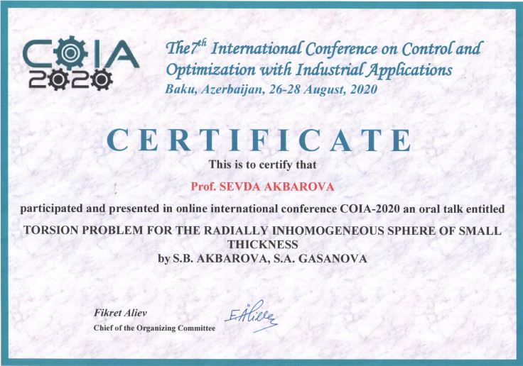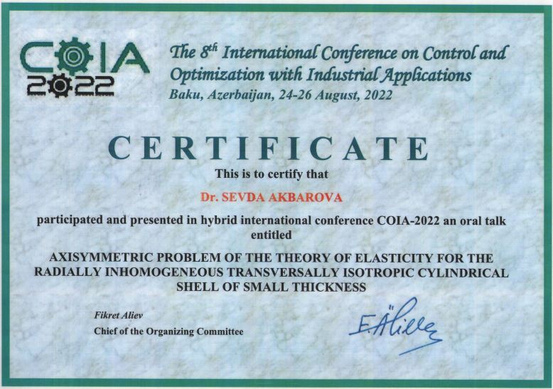 14.12.2010-cu ildə “Radius boyu qeyri-bircins kiçik qalınlıqlı transversal-izotrop silindr üçün elastikiyyət nəzəriyyəsi məsələsinin asimptotik təhlili” mövzusunda dissertasiya işi müdafiə edərək riyaziyyat üzrə fəlsəfə doktoru elmi adı almışdır.